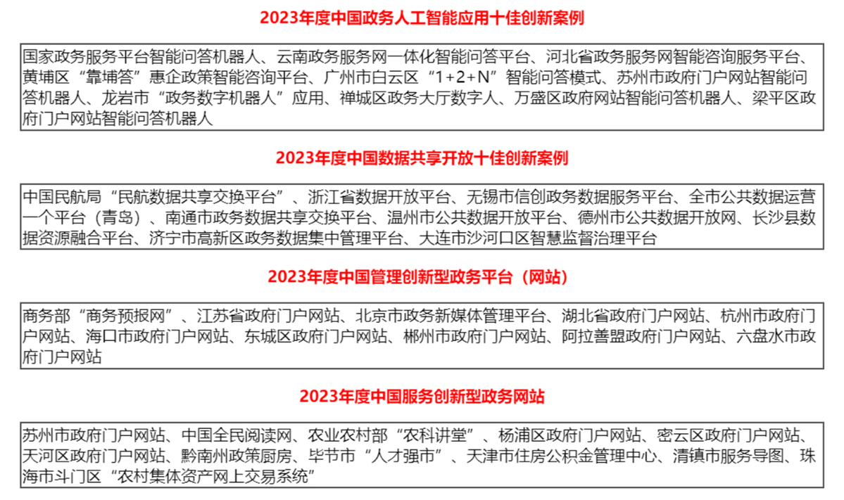 本次评估继续依据“分类指导、创新引领”的工作思路,以建设公开、透明、智慧、实用、便捷、高效的数字政府政务平台为目标,以太昊国际智库Tahaoo互联网+大数据评级指数作为重要参考,结合我们连续22年开展全国党务政务平台和党务政务新媒体评估的成功经验,针对全国各级党务政务平台(网站)、党务政务新媒体开展分级分类测评。尤其值得一提的是,今年以来人工智能大模型方兴未艾,为进一步创新评估体系,今年评估我们首次采用了AI智能中选,结合大数据采集、网络初选、单位自荐、专家推荐、综合评估等六大类方法推荐评选出2023年度中国最具影响力、最给力、最具动员力党务政务平台;2023年度中国领先政务网站、优秀政务网站;2023年度中国最具影响力外文版政府网站、外文版国际化程度领先型政府网站、外文版国际化程度创新型政府网站;2023年度中国最具影响力政务新媒体、优秀政务新媒体等成果以及数字政府十佳创新案例(包括2023年度数字治理、政务便民热线、“互联网+政务服务”、政务服务大厅、优化营商环境、人工智能应用以及数据共享开放等创新案例)。依次为: