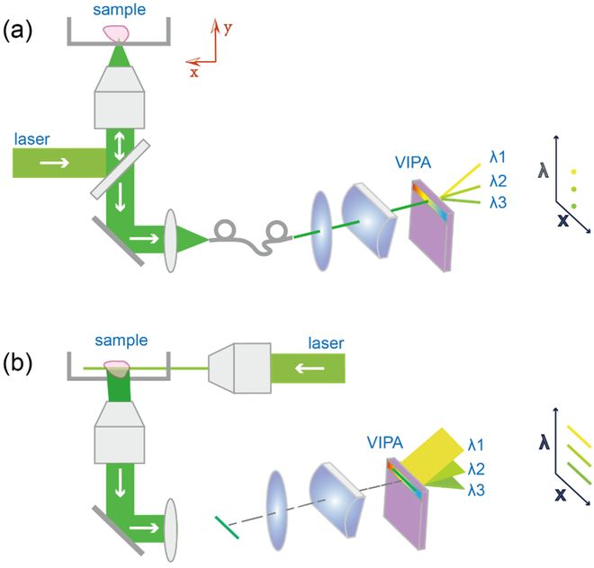 线扫描布里渊显微镜的概念由张继涛博士和Giuliano Scarcelli博士于2016年首次提出。如图1所示。在共聚焦布里渊显微镜中(a),布里渊信号的激发和收集都由同一个物镜实现,光谱仪每次只能测量一个会聚光斑处的信息。为获得二维或三维布里渊图像,需要逐点扫描该光斑。而在线扫描布里渊显微镜中(b),信号的激发和收集则有两个分立的物镜实现。在这种情况下,光谱仪每次可同时获得激发线)的信号,大大降低了成像时的测量时间。