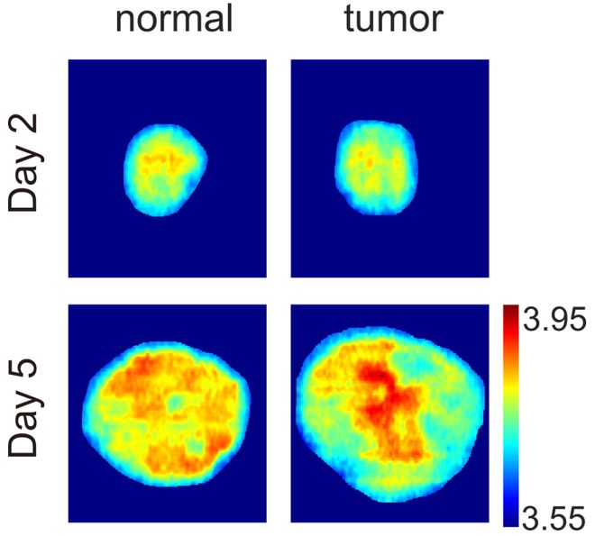 研究者首先用健康细胞球体对该技术进行了可行性验证。他们能在几分钟内完成对100*200*10像素的三维弹性成像,单像素的等效测量时间为1毫秒。随后,在小于一分钟的尺度上,他们捕捉到了细胞球体硬度因外界渗透压的改变而产生的变化。最后,他们对健康细胞球体和肿瘤细胞球体进行了长达五天的对比测量(图3)。结果表明,肿瘤细胞球体比健康细胞球体的硬度变化更大,且在球体内呈现出不同的硬度分布模式。这是肿瘤细胞球体三维硬度成像的首次报道,将有助于建立用弹性成像区分肿瘤细胞的临床诊断新方法。